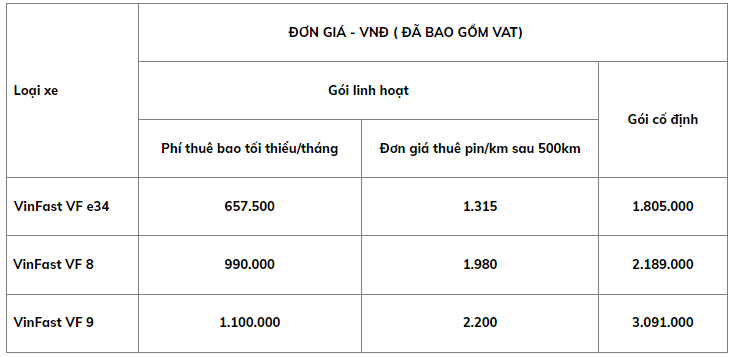 – Gói thuê pin linh hoạt: Chỉ từ 657.500 VNĐ/tháng cho quãng đường tối đa 500km/tháng. Trường hợp đi quá 500 km/tháng, khách hàng sẽ trả thêm phí thuê pin theo đơn giá chỉ từ 1.315 VNĐ/km vượt.