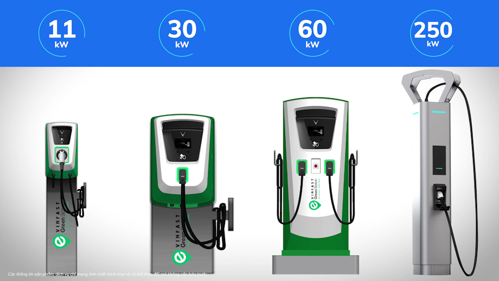 VinFast cung cấp 4 loại trụ sạc 11kW, 30kW, 60kW, 250kW đáp ứng nhu cầu sử dụng đa dạng của người dùng
