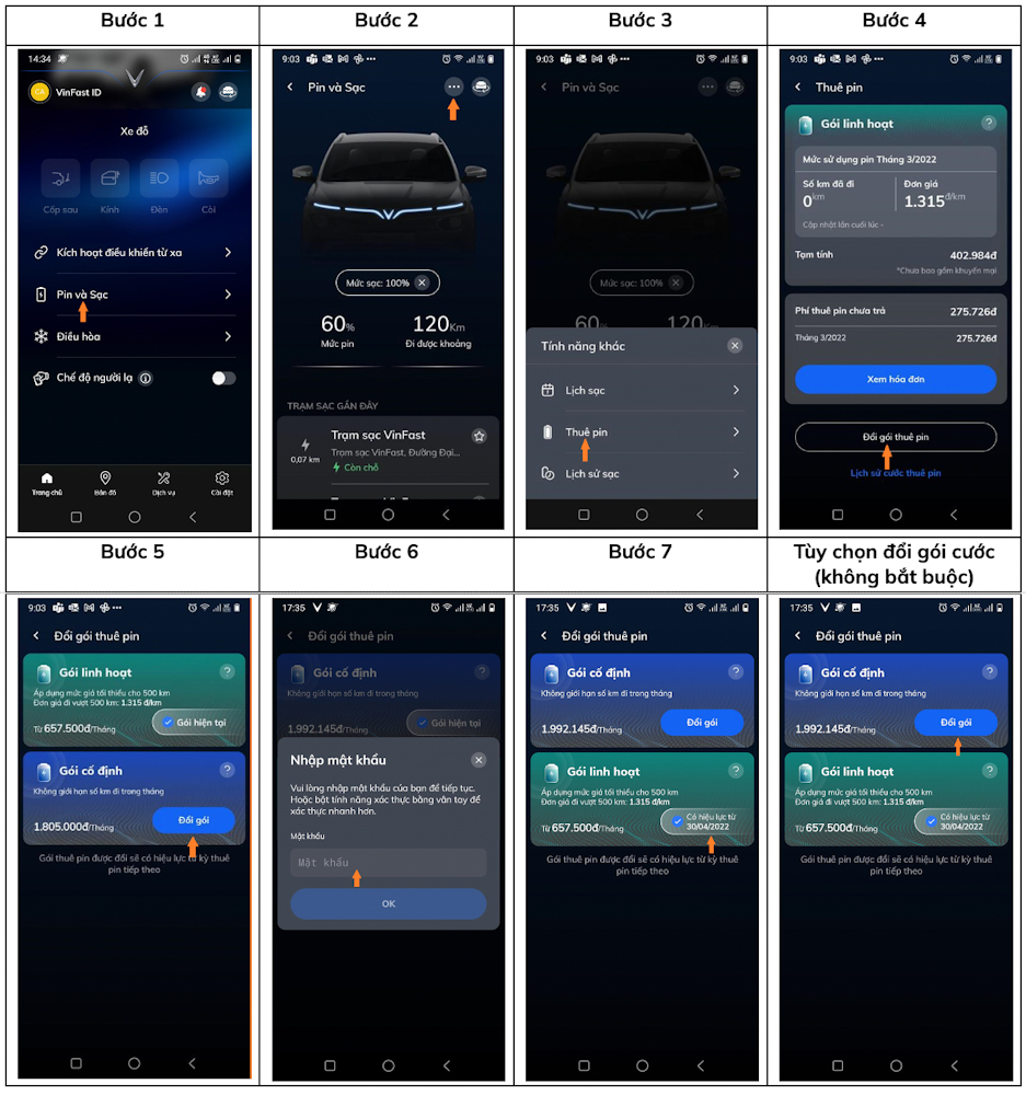 Để tra cứu, theo dõi thông tin gói cước thuê pin hàng tháng thông qua ứng dụng VinFast, khách hàng cần thực hiện các bước như sau:
