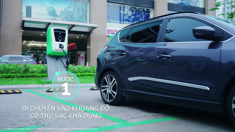 Bước 1: Khách hàng di chuyển xe vào vị trí khoang sạc của trụ sạc khả dụng. Chủ xe có thể nhận biết trụ nào khả dụng nếu đèn LED ở hốc cắm súng sạc hiển thị màu xanh lá cây.