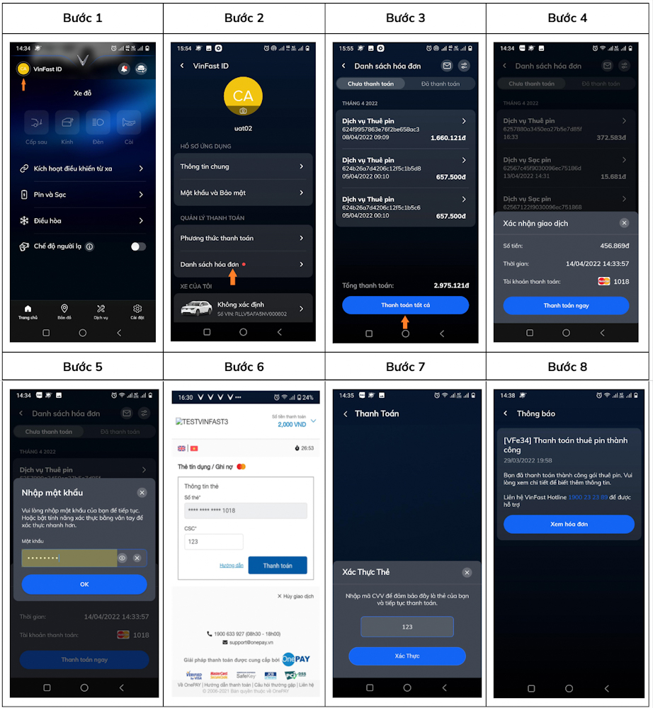 Việc thanh toán chi phí thuê pin hàng tháng hoặc sạc điện tại trạm được thực hiện dễ dàng thông qua giao dịch trên điện thoại di động. Khách hàng cần kết nối ứng dụng với tài khoản mobile banking hoặc thẻ tín dụng hiện có để tiến hành chuyển khoản. Việc trả phí sạc có thể thực hiện ngay khi việc sạc kết thúc hoặc thanh toán 1 lần (muộn nhất) vào ngày 15 của tháng tiếp theo cho toàn bộ phí dịch vụ của tháng trước đó.