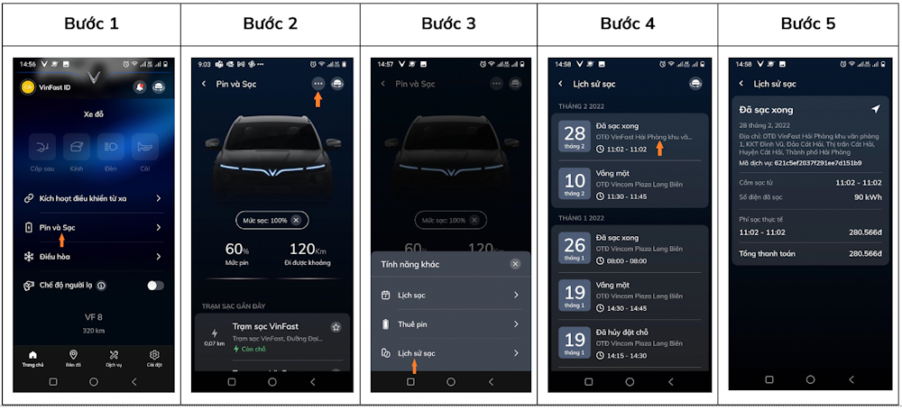 – Bước 5: Ứng dụng hiển thông tin chi tiết về thời gian, địa điểm sạc, năng lượng sử dụng và số tiền của phiên sạc.
